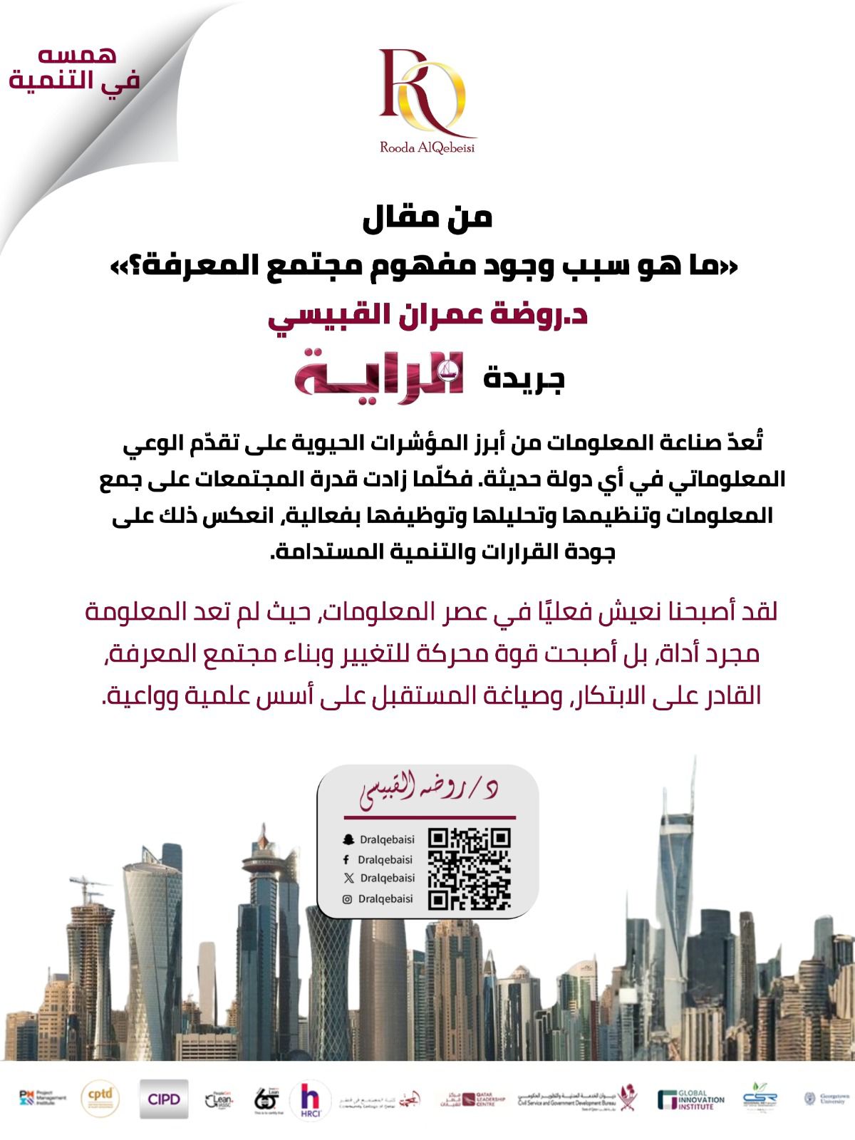 #وزارة_الثقافة #جريدة_الراية #روضة_القبيسي #مجتمع_المعرفة #الوعي_المعرفي #الثقافة_القطرية #المقال_الأسبوعي #فكر_قطر #مقالات_مميزة #صناعة_المعرفة #الابتكار #تطوير_المجتمع #QatarCulture #KnowledgeSociety #RodaAlQebaisi #AlRayaNewspaper #MinistryOfCulture #QatarVision